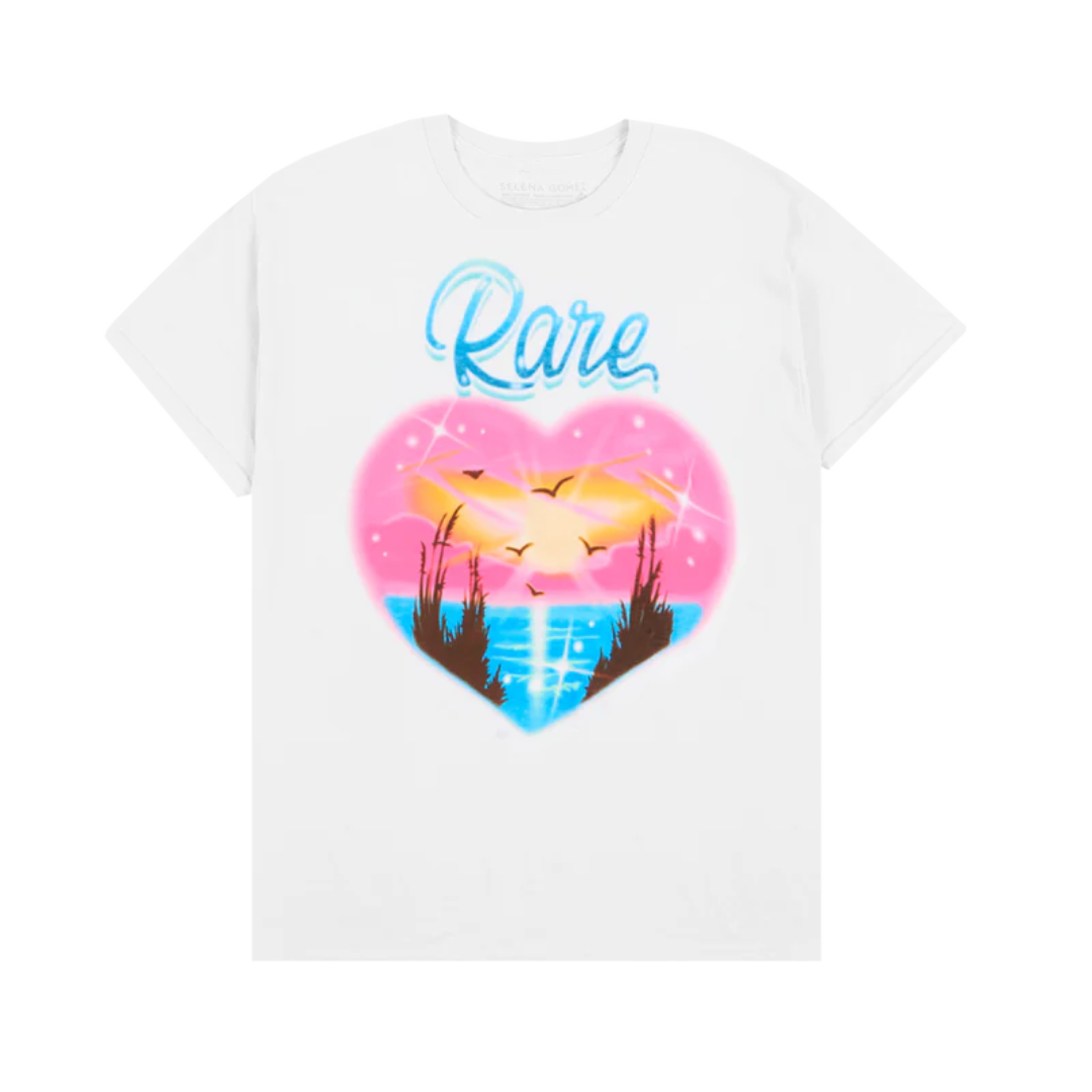 Camiseta branca unissex tingida em peça com estampa da capa do álbum "RARE" da Selena Gomez.