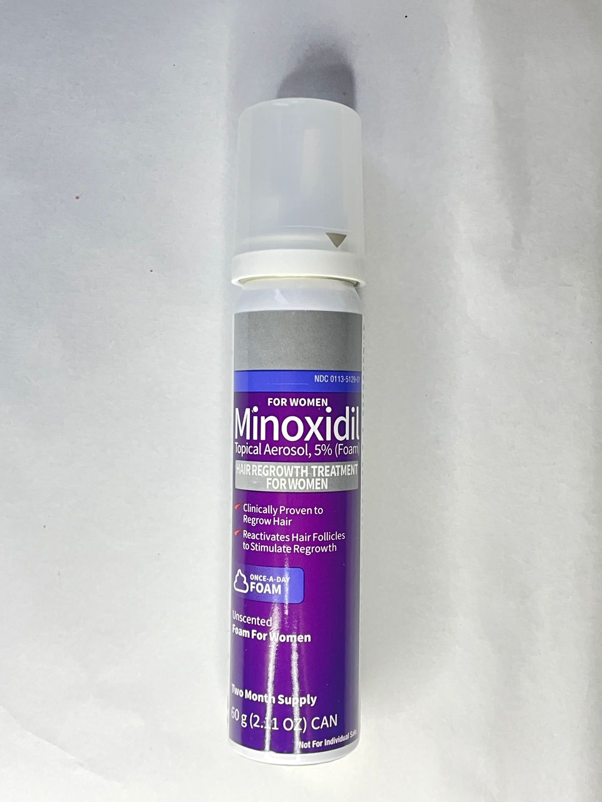 Espuma de cor branca, contendo 5% de minoxidi.