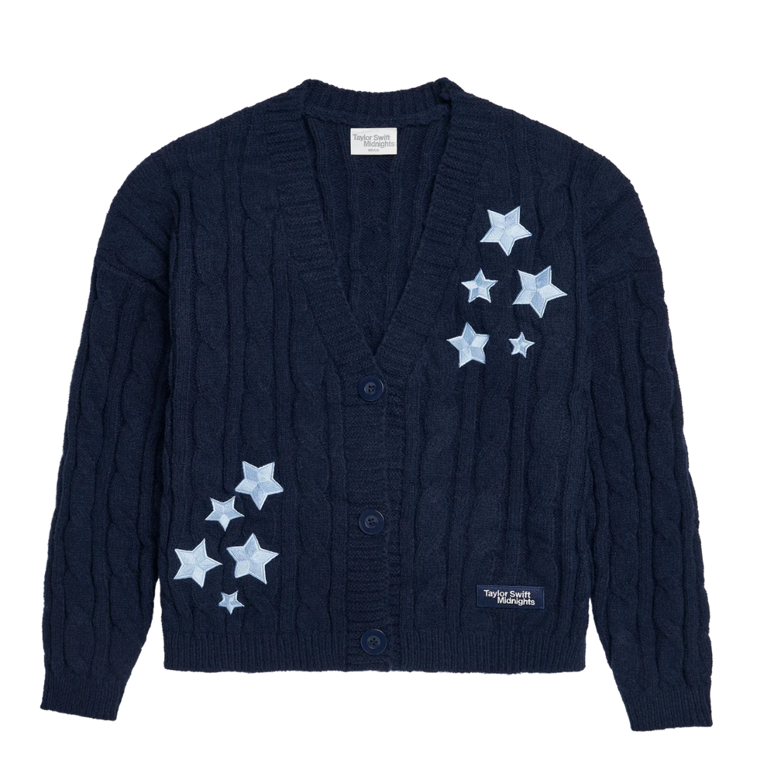Cardigã azul-marinho de tricô com três botões, 10 estrelas azul-claras bordadas na frente e 10 estrelas azul-claras bordadas nas costas, e patch "Taylor Swift Midnights" costurado na barra frontal esquerda.